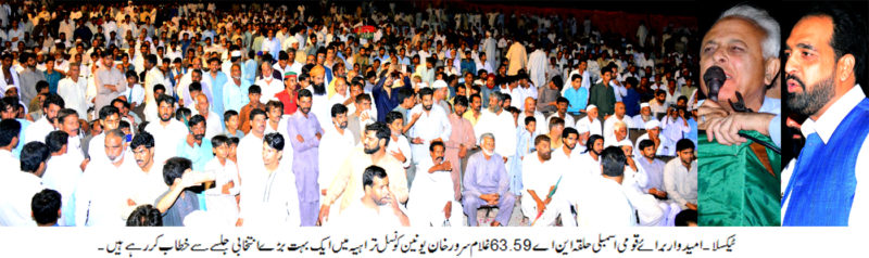پاکستان تحریک انصاف کے مرکزی سنئیر نائب صدر ،امیدوار برائے قومی اسمبلی حلقہ این اے63,59غلام سرور خان نے کہا ہے کہ جس شخص نے عوام کی طاقت سے متعدد مرتبہ اقتدار کے مزے لوٹے مگر اس حلقہ کے عوام کو یکسر نظر انداز کر دیا،اب پھر جب مشکل پیش آئی تو اس حلقہ کے عوام کی ہمدردیاں حاصل کرنے کے لئے معصوم بن کر عوام سے ووٹ مانگ رہا ہے میں نے تہہ کر رکھا ہے کہ اسکی گندی سیاست سے علاقہ کو پاک کرکے دم لوں گا ،تحریک انصاف کی کامیابی قوم کی کامیابی ہے،عمران خان اس قوم کی تقدیر بدلنا چاہتا ہے، چوروں لٹیروں کو کیفر کردار تک پہنچانا ہمارا مشن ہے ان خیالات کا اظہار انھوں نے یونین کونسل تراہیہ میں راجہ عمران جاویدکی جانب سے منعقدہ ایک بہت بڑے جلسہ سے خطاب کے دوران کیا ،تقریب سے حلقہ پی پی10سے صوبائی امیدوار چوہدری افضل پڑیال، حلقہ پی پی13سے امیدوار حاجی امجد چوہدری ،حلقہ پی پی12کے امیدوار واثق قیوم نے بھی خطاب کیا،غلام سرور خان نے کہا کہ جس شخص کو اس حلقہ کے عوام نے متعدد مرتبہ اقتدار کے اونچے ایوانوں تک پہنچایا اس نے اس علاقہ کے عوام کے لئے صحت ،تعلیم کے لئے کچھ نہ کیا ،انشااللہ ہم نے اس علاقہ میں صحت، تعلیم کو اؤلیت دینی ہے، عوام کی تیس سالہ محرومیوں کا خاتمہ کرنا ہے اور اپنی آنے والی نسلوں کے روشن اور محفوظ مستقبل کے لئے بہترین ماحول فراہم کرنا ہے،عمران خان ملک و قوم کو بحرانوں سے نکالنے کے لئے ایک جامؑ پروگرام رکھتے ہیں جس پر عمل پیرا ہو کر پاکستان ترقی کی منازل طے کرے گا، دریں اثناء یونین کونسل اڈیالہ کے گاؤں گورکھپور میں راجہ جہانگیر کی رہائش گاہ پر بھی خطاب کیا اس موقع پر حاجی محمد سلیم گروپ نے غلام سرور خان اور تحریک انصاف کے نامزد امیدواروں کی بھرپور حمایت کا اعلان کیا ،غلام سرور خان نے تحریک انصاف میں شمولیت اختیار کرنے والے دوستوں ،بزرگوں اور نوجوانوں کا شکریہ ادا کیا اور انھیں یقین دہانی کرائی کہ انشااللہ پارٹی میں انکو اگلی صفوں میں مقام دینگے ،اس وقت ہر باشعور شہری ملک کے اندر حقیقی تبدیلی کے لئے کوشاں ہے