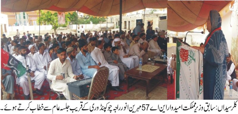 سابق وزیر مملکت این اے 57سے پیپلز پارٹی کی امیدوار مہرین انور راجہ نے کہا ہے کہ پیپلز پارٹی وفاق کی علامت ہے اس نے صوبوں کو حقوق دئیے عوام 25جولائی کو ملک بھر میں تیر کے حامل امیدواروں کو بھاری اکثریت سے کامیاب کریں ان خیالات کا اظہار انہوں نے اتوار کے روز یہا ں چوکپنڈوری کے قریب موہڑہ حیال میں ایک اجتماع سے خطاب کرتے ہوئے کیا جس کی صدارت چوہدری احمد نے کی اجتماع میں چوہدری غضنفر حیات اور دیگر نے پیپلز پارٹی میں شمولیت کا اعلان کیا۔تقریب سے محمد اعجاز بٹ ،یاسر بشیر راجہ، راجہ سعید افضل، ماسٹر طاہر نے بھی خطاب کیا مہرین انور راجہ نے کہا کہ انہوں نے پیپلز پارٹی کے دو ر اقتدار میں کہوٹہ ہسپتال اور کالجز کو اپ گریڈ کرایا مگر پنجاب کی ن لیگی حکومت نے رکاوٹ ڈالی میں نے سوئی گیس کی فراہمی کے لیے فنڈز ٹرانسفر کرائے جسے بعد میں لیگی حکومت نے اپنے نام کے ساتھ استعمال کیا انہوں نے کہا کہ میرے حوصلے بلند ہیں مجھے پیپلز پارٹی کی جیا لی ہونے پر فخر ہے میں بھٹو افکار کے فروغ کے لیے کوشاں ہوں عوام منفی پروپگینڈے پر کان نہ دھریں اور 25جولائی کو تیر کے نشا ن پر مہر لگا کر بھٹو خاندان سے اپنی عقیدت کا عملی اظہار کریں