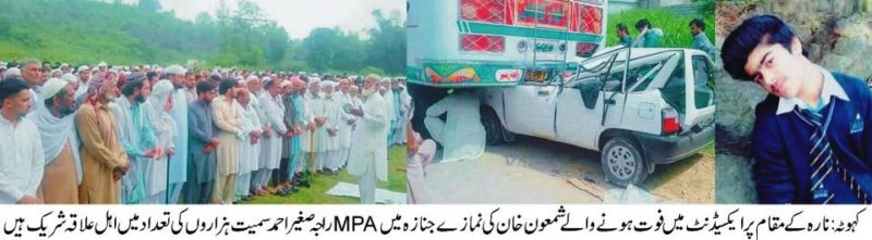 Kahuta; Shamoon Khan of Baghar Shareef was killed in a fatal accident, when the car he was passenger in hit a bus. Namaz e janaza was performed with large number of people.