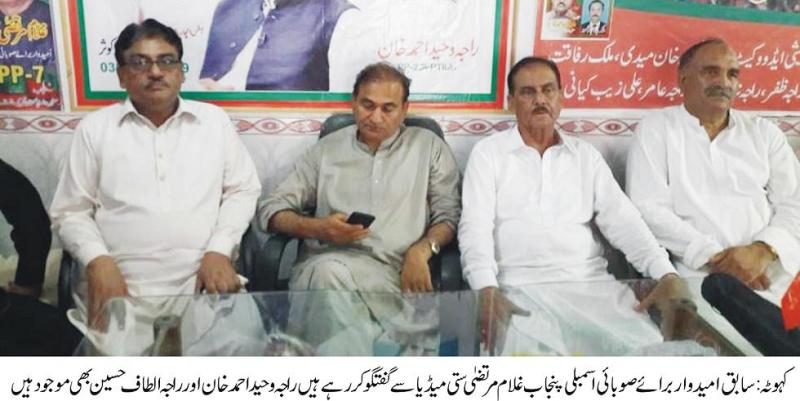 پی ٹی آئی رہنماء غلام مر تضیٰ ستی سابق امیدوار برائے صوبائی اسمبلی پنجاب نے میڈیا کے نمائندوں سے گفتگو کرتے ہوئے کہا کہ قائد تحریک انصاف عمران خان مبارکباد کے مستحق ہیں کہ ان کی حکومت وفاق اور اکثریتی صوبوں میں بن رہی ہے ملک عوام کے لیے عمران خان واحد امیدکی کرن ہیں ان خیالات اظہار پی ٹی آئی رہنماء غلام مر تضیٰ ستی سابق امیدوار برائے صوبائی اسمبلی پنجاب نے مر کزی پبلک سیکرٹریٹ کوٹلی لنک روڈ کہوٹہ میں میڈیا کے نمائندوں سے گفتگو کرتے ہوئے کیا اس موقع پر پی ٹی آئی کے رہنماء راجہ وحید احمد خان ، جنرل سیکر ٹری پی ٹی آئی راجہ الطاف حسین ، سیکر ٹری اطلاعات راجہ پر ویز اقبال سمیت دیگر پی ٹی آئی کارکنان موجود تھے ۔ غلام مرتضیٰ ستی نے کہا کہ میں حلقہ پی پی سات میں موجود اپنے تمام ووٹروں ، سپورٹروں ، کارکنوں اور ورکروں کا شکریہ ادا کر تا ہوں جنہوں نے مجھے اپنا ووٹ دیا ہے انہوں نے کہا پاکستان موجود ہ تمام درپیش مساہل سے عمران خان ہی نکال سکتے ہیں پانی ، بجلی ، مالی و معاشی مساہل انتہائی نازک موڑ پر ہیں اس لیے عمران خان کو اپنی ٹیم کا انتخاب انتہائی دانشمندی سے کرنا ہو گا عمران خان نے نڑھ ٹورازم کے ایک پیکج کا کہا تھا جو اس علاقے کی پسماندگی کو دور کر نے کے لیے ایک سنگ میل ثابت ہوتا میں اپنے ان تمام ووٹروں کے ساتھ ہوں جنہوں نے مجھے انتہائی ذوق وشوق کے ساتھ ووٹ دیے ہیں ۔