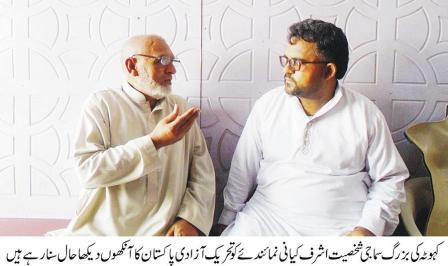 اشرف کیانی نے کہا کہ میں نے پاکستان بنتے اپنی آنکھوں سے دیکھا ہر طرف آگ ہی آگ تھی۔ مسلمان سکھوں اور ہندوں کو ماررہے تھے اور ہندوں اور سکھ مسلمانوں کو ہرطرف لاشوں کے ڈھیر لگئے ہوئے تھے ۔لٹے پٹے لوگ آتے تھے ۔قیام پاکستان سے پہلے سکھ اور ہندوں کا برتاو مسلمانوں سے ساتھ اچھا تھا۔مگر جب تحریک آزادی چلی تو ان کا رویہ اچھا ناں تھا ہم سب اگھٹے رہتے اور کھیلتے تھے وہ ہماری شادیوں میں آتے تھے ہم ان کی شادیوں میں جاتے تھے ۔آج اپنے ملک کو آزاد دیکھ کر خوشی محسوس ہوتی ہے مگرملکی مسائل اور دہشت گردی دیکھ کر دل خون کے آنسو روتا ہے ملک کو اس وقت قاہد محترم جناب محمدعلی جناحؒ جیسے لیڈر کی ضرورت ہے ۔ان خیالات کا اظہار تحصیل کہوٹہ کے بزرگ سیاسی وسما جی شخصیت اشرف کیانی نے نوجوان صحافی کبیر احمد جنجوعہ سے گفتگو کر تے ہوئے کیا جب پاکستان آزاد ہوا تو میری عمر15سال تھی میں وہ خون کا منظر اپنی آنکھوں سے دیکھا تھا جس کو میں ساری زندگی بھلا نیں سکتا انہوں نے کہا کہ قیام پاکستان سے پہلے ہندوں اور مسلمان اگھٹے رہا کرتے تھے ان کا رویہ مسلمانوں کے ساتھ اچھا تھا مگرجب آزادی پاکستان کی تحریک نے زور پکڑا تو ان کا رویہ مسلمانوں کے ساتھ اچھا ناں رہا۔انہوں نے کہا کہ آج تو ہر دوسرا شخص لکھ پتی، کروڑ پتی اور ارب پتی ہے مگر اس وقت بہت غربت ہوا کرتی تھی ہم یہ اشیاء اناج کے بدلے لیا کرتے تھے ۔ہم محنت مزدروی کرتے تھے دیسی اشیاء کھاتے تھے لسی ،کڑی ،دیسی گھی،مکئی کی روٹی ،سرسوں ساگ اور چٹنی استعما ل کیا کرتے تھے ۔آج کی ملاوٹ شدہ کھانے کھا کھا کرہمارے معدے ختم ہو گئے ہیں ۔ایک پوچھے گئے سوال کے جواب میں انہوں نے کہا کہ ہندوں کی شادیوں پر جایا کرتے تھے جب میں پہلی مرتبہ جب میں ان کی شادی پر گیا تو ان کا نکاح دیکھا تو حیران ہو گیا کہ آگ کے گرد پہلے عورت نے مر د کے پیچھے سات چکر لگائے اور پھر مرد نے عورت کے پیچھے جب ان کو سب ملے اور مبارکباد دی تو میں حیران ہو گیا کہ ایسے ہوتا ہے ان کا نکاح ۔ انہوں نے کہا کہ آج ملک کے حالات دیکھ کر دل خون کے آنسوں روتا ہے اس وقت ملک کو قاہد اعظم محمد علی جناح جیسا لیڈر کی ضرورت ہے جو ملک کے مساہل حل کرئے ۔