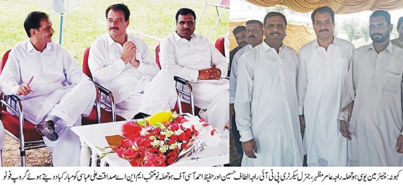 چیئرمین یوسی ہوتھلہ راجہ عامر مظہر ، جنرل سیکر ٹری پی ٹی آئی راجہ الطاف حسین اورحفیظ احمد آسی آف ہوتھلہ کی طرف سے ہ نو منتخب ایم این اے صداقت علی عباسی کو مبارکباد۔ گذشتہ روز قبل چیئرمین یوسی ہوتھلہ راجہ عامر مظہر ، جنرل سیکر ٹری پی ٹی آئی راجہ الطاف حسین اورحفیظ احمد آسی آف ہوتھلہ نے نو منتخب ایم این اے صداقت علی عباسی کی رہائش گاہ پر جا کر ان سے ملاقات کی اور الیکشن میں کامیابی پر ان کو دلی طور پر مبارکباد پیش کی ۔چیئرمین یوسی ہوتھلہ راجہ عامر مظہرنے کہا کہ صداقت علی عباسی چیئرمین تحریک انصاف عمران کے ان ساتھیوں میں سے ہیں جنہوں نے عمران خان کا اس وقت ساتھ دیا جس وقت انہوں نے اپنی سیاسی جماعت کی بنیاد رکھی عرصہ22سال سے صداقت علی عباسی دن رات محنت کر رہے ہیں جس کا پھل اللہ پاک ان کو حالیہ ہونے والے الیکشن میں دے دیاہے انہوں نے امیدظاہر کی ہے کہ صداقت علی عباسی اپنے حلقے کی عوام کے تمام مسائل حل کر یں گے ۔