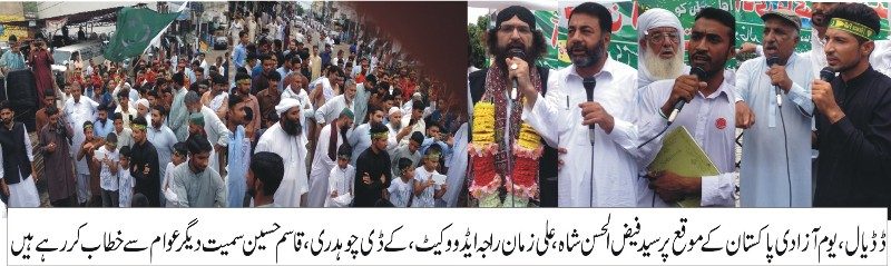 جشن آزادی 14 اگست کے حوالہ سے اسلامی جمیعت طلباء ڈڈیال کی ایک پروقار تقریب ایک مقامی ہوٹل میں منعقد ہوئی تقریب کا آغاز تلاوت قرآن پاک سے کیا گیاتلاوت قرآن پاک کے بعد ہدیہ نعت پیش کی گئی جس کے بعد باقاعدہ طور پر تقریب کا آغاز کیا گیا یوم آزادی پاکستان کے حوالہ سے منعقد تقریب کے سٹیج سیکرٹری کے فرائض ضلعی جنرل سیکرٹری چوہدری طلحہ منیرنے سرانجام دیے تقریب سے خطاب کرتے ہوئے امیر حلقہ ملک تصور نے کہاکہ ملک پاکستان کو حاصل کرنے کے لیے ہمارے بزرگوں نے بڑی قربانیاں دی ہیں ملک پاکستان ایک ملک کا نام نہیں بلکہ ایک نظریہ ہے جو کہ کلمہ شہادت پر حاصل کیا گیا ہے انہوں نے کہاکہ انشاء اللہ تعالیٰ پیارا پاکستان رہتی دنیا تک رہے گا اور اللہ تعالیٰ اس کی حفاظت کرنے والے ہیں اس موقع پر تقریب سے سابق امیر حاجی عبدالواحد نے خطاب کرتے ہوئے کہاکہ آج کا بابرکت دن بڑی خوشی کا دن ہے یہ دن ہمارے اباؤاجداد نے ہرقسم کی قربانیاں جن میں جانی و مالی سمیت دے کر حاصل کیا ہے انہوں نے کہاکہ ہمیں چاہے کہ ہم پاکستان میں قرآن و سنت کی روشنی میں اپنی زندگیاں گزاریں تقریب میں دیگر مقررنین نے بھی خطاب کیا جشن آزادی کی منعقدہ تقریب کے اختتام پر کیک بھی کاٹا گیا،14 اگست یوم آزادی پاکستان کی تقریب میں ضلعی ناظم خاور خلیل، وجی السلام، عثمان یاسر، عمرمنیر،جاوید خان،راحیل اشرف، آکاش چوہدری،سفیان طاہر ،سعدہاشمی، سمیع ساحل سمیت دیگر نے بڑی تعداد میں شرکت کی۔
