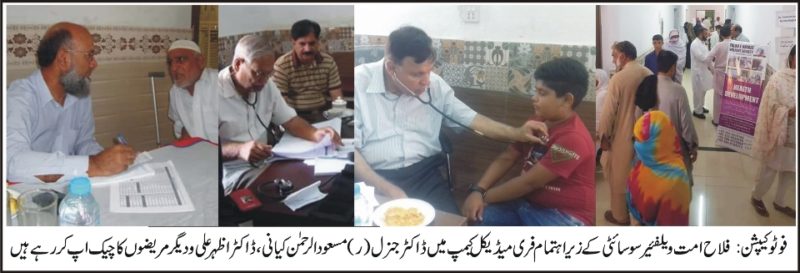 فلاح امت ویلفئیر سوسائٹی کے زیر اہتمام رفاہ انٹر نیشنل اور پناہ کے تعاون سے فری میڈیکل کیمپ کا انعقاد فلاح امت ویلفئیر کمپلیکس جنڈ نجار میں کیا گیا
