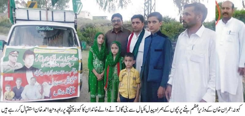 عمران خان کا وزیر اعظم بننے کی منت مانگنے والا شخص پیدل نکیال سے بنی گالہ روانہ ۔کہوٹہ پہنچنے پر پی ٹی آئی کے سینئر رہنماء راجہ وحید احمد خان نے استقبال کیا تفصیل کے مطابق نکیال کوٹلی آزاد کشمیر کا رہائشی شاہپال مغل نے منت مانگی تھی کہ اگر عمران خان وزیر اعظم بن جاہیں تو وہ اپنے خاندان سمیت پیدل بنی گالہ جائے گا ۔عمران خان کے وزیر اعظم بننے کے بعد شاہپال مغل اپنے بچوں کے ہمراہ پیدل بنی گالہ کی طرف سفر شروع کیا جس پر وہ آج کئی ہفتوں کے بعد کہوٹہ پہنچا جس کا کہوٹہ پہنچنے پر پی ٹی آئی کے سینئر رہنماء راجہ وحید احمد خان اور صحافی ملک عامر محمود نے استقبال کیااور ان کے جذبے کو سلام پیش کیا ۔