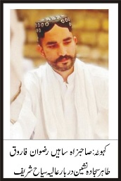 صاحبزاہ ساہیں رضوان فاروق طاہر سجادہ نشین دربار عالیہ سیاح شریف کو پاکستان عالمی مشائخ کونسل کی طرف سے انگلیڈکا صدر منتخب کیا گیا ۔صاحبزاہ ساہیں رضوان فاروق طاہرکو کہ کہوٹہ کے رہائشی ہے ہیں اور (UK) میں ان کی رہائش آستانہ عالیہ بولٹن ،گریٹرمانچسٹر یو۔کے میں ہے اور یہ دربار عالیہ سیاح شریف آزاد کشمیر کے سجادہ نشین بھی ہیں ۔صاحبزاہ ساہیں رضوان فاروق طاہرکو پاکستان عالمی مشائخ کونسل کی طرف سے انگلیڈکا صدر منتخب ہونے پر تحصیل کہوٹہ کی مذہبی ، سیاسی ،سماجی اور ادبی شخصیات نے مبارکباد پیش کی ہے اور امید ظاہر کی ہے کہ ہے ان کو جو زمہ داری سونپی گئی ہے وہ احسن طریقے سے سر انجام دیں گے ۔