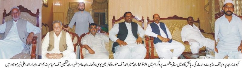 راجہ پر ویزآف دڑیوٹ وارث کی طرف سے راجہ صغیر احمدآف مٹور کے اعزاز میں ریفریشمنٹ کا اہتمام ۔چیئرمین یونین کونسل ہوتھلہ امیدوار برائے تحصیل ناظم کہوٹہ راجہ عامر مظہر ،معروف ٹرانسپورٹرراجہ ثقلین آف ممیام ، راجہ شیر احمد ،ندیم احمد،ابرار احمد ، ممبر پریس کلب کہوٹہ کبیر احمد جنجوعہ نے بھی شر کت کی۔