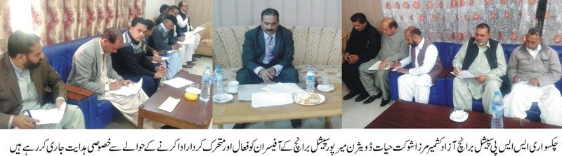 ایس ایس پی سپیشل برانچ آ زاد کشمیر نو تعینات مر زا شوکت حیات نے کہا کہ پولیس اہلکاران کسی بھی قسم کے دباؤ میں آ ئے بغیر قومی اور ملی جذبے کے ساتھ اپنے فرائض منصبی سرانجام دیں داخلی اور خارجی راستوں کی کڑی نگرانی کرتے ہو ئے کالعدم تنظیموں کی نقل و حرکت منشیات فروشوں ناجائز اسلحہ کی خرید وفروخت فحاشی کے اڈوں چوری اور ڈکیتی میں ملوث گروہوں کی نشاندہی و گرفتاری کو یقینی بنا ئیں فرقہ واریت کے ساتھ کرپشن کے خاتمے کیلئے بھی اپنا موثرکردار ادا کریں محکمہ پولیس میں کالی بھیڑوں کی بھی نشان دہی کریں تا کہ ان کے خلاف بھی محکمانہ قانونی کارروائی عمل میں لا ئی جا سکے ان خیالات کااظہار انہوں نے انسپکٹر جنرل پولیس آ زاد کشمیر شعیب دستگیر کی ہدایت پر ملکی اور علاقا ئی حالات کے پیش نظر میرپور ڈیثرن کی سطح پر سپیشل برانچ کے آفیسران کو فعال اور متحرک کرنے کیلئے پی ڈبلیو ڈی میرپور ریسٹ ہا ؤس میں ایک میٹنگ کے دران خصوصی ہدایات جاری کرتے ہوئے کیا ایس ایس پی سپیشل برانچ مر زا شوکت حیات نے کہا کہ پولیس لوگوں کی عزت وآبرو جان و مال کی محافظ ہے پولیس اور شہریوں کے درمیان کوئی دوری یا خلاء نہیں ہونا چا یئے پولیس کو درپیش مسائل کے حل کیلئے بھی اقدامات اٹھا ئے جا رہے ہیں اس موقع پر سپیشل برانچ ڈویثرن میر پور کے آفیسران نے اپنے اپنے اضلاع کے حوالے سے ایس ایس پی سپیشل برانچ مر زا شوکت حیات کو تفصیل سے اگاہ کیا اور اس عزم کا عادہ کیا کہ قانون کی بالا دستی اور جرائم کے مکمل خاتمے کیلئے سپیشل برانچ کے پولیس اہلکاران اپنی ذمہ داریاں احسن انداز میں ادا کرینگے ۔