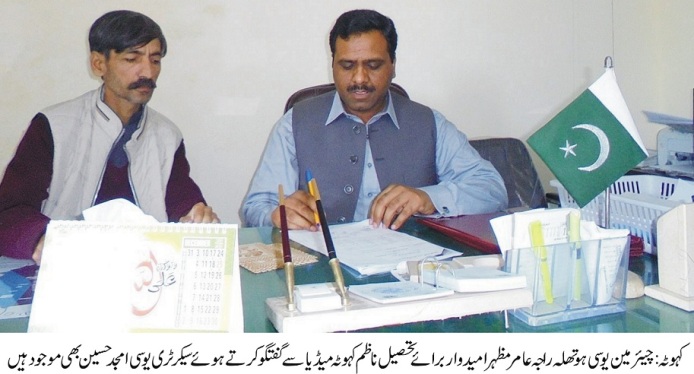 چیئرمین یوسی ہوتھلہ راجہ عامر مظہر امیدوار برائے تحصیل ناظم کہوٹہ نے اپنے آفس میں میڈیا کے نمائندوں سے گفتگو کرتے ہوئے کہا کہ وزیر اعظم اسلامی جمہوریہ پاکستان عمران خان نے امریکہ کے صدر ڈونلڈ ٹرمپ کو کرارہ جواب دے پاکستانی عوام کے دل جیت لیے پاکستانی عوام بھی دنیا کے ساتھ عزت کے ساتھ چلنا چاہتے ہیں اور پاکستان دنیا کے برابر کے تعلقات چاہتا ہے کیونکہ ہم غیرت کا سودا نہیں کر سکتے سب سے پہلے پاکستان پھر پاکستانیوں کی عزت اور بھی دنیا کے ساتھ پاکستان کے مفادمیں جو بہتر ہو گا ان تعلقات پر ہر پاکستانی کی خوائش ہے انہوں نے کہا کہ پاکستان کے وزیر اعظم عمران خان نے امریکہ کے صدر کو جو جواب دے کر دنیا کو بتا دیا کہ اب پاکستان کسی کے اشارے پر نہیں چلے گا ناں پاکستان کے مفاد کے بغیر کسی کی مداخلت برداشت کی جائے گئی یہی غیرت مند قوم کی نشانی ہے انہوں نے کہا کہ پاکستان دنیا کی بہترین فوج رکھتا ہے اور ہماری فوج نے بہت سی قربانیاں دی ہیں پاکستان دہشت گردی کو ختم کر نے کے لیے بہت سی قربانیاں دے چکا ہے اور پاکستان کی مسلح افواج نے بہت مہارت سے پاکستان کے اندر دہشت گردی ختم کی ہے اوراس ملک کی خاطر افواج پاکستان ،سولین،سیکورٹی اداروں اپنی جانوں کے نذرانے دیے ہیں ۔انشاء اللہ ہمار ا پیار املک قیامت تک پابندہ رہے گا ۔