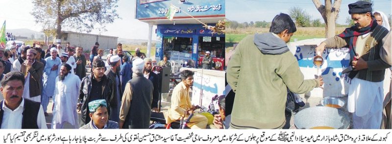کہوٹہ کے علاقہ ڈیرہ مشتاق شاہ بازار میں عید میلاد النبی ﷺ کا جلوس ۔معروف سماجی شخصیت آغا سید مشتاق حسین نقوی کی طرف سے شرکاء میں لنگر بھی تقسیم کیا گیا ۔تفصیل کے مطابق گذشتہ روز عید میلاد النبیﷺ کے سلسلے میں ڈیرہ مشتاق شاہ بازار میں بھی عید میلاد النبی ﷺکے سلسلے میں محفل کا اہتمام کیا گیا جس میں ،گھرانگ سیداں ، نوگراں ، پیکاں ، ٹیری اور کلانہ کے کثیر تعداد میں عوام نے شر کت کی اس موقع پر معروف سماجی شخصیت آغا سید مشتاق حسین نقوی کی طرف سے ان کے بھتیجے اور علاقے کی معروف سیاسی وسماجی شخصیت ممبر امن کمیٹی سید نجم الحسن نقوی نے میلاد میں شریک سینکڑوں افراد کو شربت پلایا او ر ان میں لنگر بھی تقسیم کیا گیا علمائے کرام نے سیرت النبی ﷺ کے حوالے سے اپنا اپنا بیان کیا اور ثناء خوان مصطفی نے آقائے دو جہاں کی بارگاہ میں ہدیہ عقیدت کے پھول نچھاور کیے آخر میں تمام عالم اسلام کی خیرو بر کت کے لیے خصوصی دعا ء کی گئی ۔