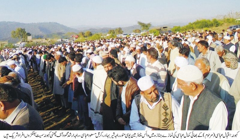 راجروٹ کے رہائشی سابق ناظم یوسی پنجاڑ اقبال عباسی (مرحوم) کے بڑھے بھائی اور عابد اقبال عباسی کے تایا کمال عباسی وفات پا گے ۔ان کی نمازے جنازہ دوبیرن پاٹیاں کے مقام پر ادا کیا گیا ۔نمازے جنازہ میں وائس چیئرمین یوسی مٹور راجہ شیر بہادر ، کرنل مسعود عباسی ، معروف سیاسی وسماجی شخصیت راجہ ارشد محمود آف چھنی کہوٹہ ،برگیڈر یئر جہانذیب عباسی ، عبد القدوس عباسی ، چیئرمین یوسی پنجاڑ ماسٹر محمد ظہور عباسی ، وائس چیئرمین سردار سلطان ،عطا دوست محمد عباسی ، فیض دوست محمد عباسی ،ماسٹر انور عباسی ، راجہ عمران اللہ آف مٹور ،چیئرمین یوسی دکھالی راجہ شوکت حسین ، راشد مبارک عباسی ،مسلم لیگ ن یوتھ ونگ کہوٹہ کے صدر رفاقت جنجوعہ ،جنرل سیکرٹری حامد لطیف ستی،سیکرٹری اطلاعات عاصی جنجوعہ، راجہ فاروق آف مٹور ،راجہ عمران آف مٹور،سید ظہیر حسین شاہ ، سید لعل حسین شاہ،ضمیر عباسی باڑہ ،شوکت ستی آف سون ،ممبر پریس کلب کہوٹہ کبیر احمد جنجوعہ سمیت سینکڑوں افراد نے شرکت کی ۔