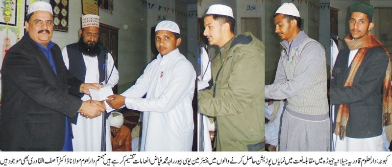 دارلعلوم قادریہ جیلانیہ جیوڑہ میں مہتمم ادارہ مولانا ڈاکٹر آصف القادری کے زیر اہتمام عیدمیلاد النبی ﷺکی پرنور محفل و مقابلہ نعت سینکڑوں افراد کی شرکت ۔چیئرمین یونین کونسل بیور راجہ محمد فیاض ،وائس چیئرمین سردار طاہر محمود ،معروف سیاسی وسماجی شخصیت سردار شاہ روم سمیت علاقے بھر کی سیاسی ، سماجی ، مدہبی شخصیات نے بھر پور شرکت کی ۔ اپنے خطاب میں ممتاز عالم دین مولانا ڈاکٹر آصف القادری ، معروف عالم دین مولانا قاری عزیز حیدر،مولانا حافظ غلام یونس قادری نے اپنے خطاب میں کہا کہ سرکار دو عالم حضرت محمد ﷺ کی ولات باسعادت کسی نعمت سے کم نہیں اسلام مکمل ضابطہ اخلاق ہے آپﷺ نے جہالت کے خاتمہ اور انسان کو انسانیت کادرس سکھایا انہوں نے کہا ہے کہ ہمیں سرکاردو عالم ﷺ کے بتائے ہو ئے راستے پر چلنا ہو گا اسی میں ہماری دنیا اور آخرت کی کامیابی ہے۔ انہوں نے کہا ہے کہ آج ضرورت اس امر کی ہے ہم اپنی آنے والی نسلوں کی بہتری کیلئے قرآن اور سنت پر عمل پیرا ہوں ، ہمیں حق و سچ کا ساتھ دینا ہو گا حضور ﷺکی سیرت طیبہ پر عمل کر کے ہم سارے مسائل کا حل کر سکتے ہیں اور رحمت العالمین حضرت محمد ﷺ کی بعثت پوری انسانیت پوری انسانیت کے لئے رحمت اور بخشیں کا ذریعہ ہے حضور ﷺ توحید اور ایمان کی روشنی لے کر آئے جس سے سارا عالم منور ہو گیا عرب میں رونما ہو نے والے اس عظیم انقلاب کا راز آپﷺ کی تعلیمات ہی تھیں جس پر عمل کر کے اہل ایمان کے دل باہمی محبت کے جذبات سے لبریز ہو گئے حضورپاکﷺ کے دامن سے وابستہ ہیں وہ امن والے ہیں اور ان امن والوں کا ہی انتہا پسندی اور دہشت گردی سے دور دور تک کو ئی تعلق نہیں ہم حضور پاک ﷺ کا میلاد مناکے اللہ تعالیٰ کی تو حید کا اعلان کر تے ہیںآقاکریم ﷺ کی آمد سے ہی کل کائنات میں رونقیں اور بہاریں آئیں انیانیت پر اللہ تعالیٰ کا سب سے بڑا انعام یہ ہے کہ اس نے حضرت محمدﷺ کو ہماری رہنمائی کے لئے دنیا میں بھیجا آپ کی سیرت طیبہ تمام انسانوں کے لئے مشعل راہ ہے آپ ﷺ نے ہمیں ایک مکمل ضابطہ حیات دیا ہے جس کے مطابق زندگی گزارنے سے ہماری زندگی بھی بہتر ہو تی ہے اور آخرت بھی سنورجا تی ہے ۔آخر میں تمام عالم اسلام کے مسلمانوں کے لیے دعا کی گئی ،مقابلہ نعت میں نمایاں پوزیشن حاصل کرنے والے ثناء خوانوں میں نقد انعامات تقسیم کیا گیا اور تمام شر کاء محفل میں لنگر بھی تقسیم کیا گیا ۔