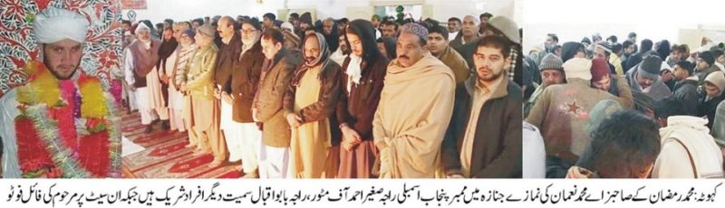 محمد رمضان کا صاحبزاہ محمد نعمان وفات پا گیا نمازے جنازہ میں ممبر پنجاب اسمبلی راجہ صغیر احمد آف مٹور سمیت کثیر تعداد میں اہلیان علاقہ کی شر کت۔ڈھوک بنگیا ل کے رہائشی محمد رمضان کا صاحبزادہ ،سلیمان راجہ اور آفتاب راجہ کا جوانسالہ بھانجامحمد نعمان وفات پا گیا مر حوم کی نمازے جنازہ میںMPAراجہ صغیر احمدآف مٹور، راجہ بابو اقبال آف ممیام سمیت کثیر تعداد میں اہلیان علاقہ نے شر کت کی ۔19سالہ محمد نعمان جو ایک خوش اخلاق اور خوش مذاج نوجوان تھا اس کی اچانک موت نے تمام بنگیال راجپوت فیملی کا خم زادہ کر دیا ۔
