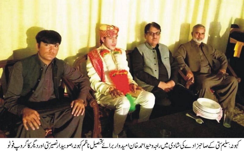 سلیم ستی کا صاحبزادہ اور ندیم تاج ستی کا کزن رشتہ ازواج میں منسلک ہو گیا ۔اس کی شادی کی دعوت ولیمہ کی تقریب میں تحصیل کہوٹہ کی معروف سیاسی وسماجی شخصیت راجہ وحید احمد خان امیدوار برائے تحصیل ناظم کہوٹہ ، صوبیدار نصیر ستی ، صدر الیکڑونک میڈیا ملک عامر محمود سمیت کثیر تعدادمعززین نے شر کت کی ۔