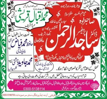 بروز اتوار دن 11بجے تانماز ظہر سالانہ عرس مبارک صوفی بزرگ مولانا محمد یعقوب آستانہ عالیہ مجددیہ بگھار شریف اور سالانہ ختم شریف راجہ محمد صدیق میرا بھٹیاں رہائش گاہ راجہ گلستان خان میں ہورہاہے جس میں خطاب ذیشان مولانا محمد اقبال قریشی اور خصوصی خطاب مفکر اسلام صاحبزادہ ڈاکٹر پروفسیر ساجد الرحمن سجادہ نشین دربارعالیہ نقشبندیہ بگھا ر شریف کا ہوگا اور خصوصی نعت شریف حافظ محمد فیاض راولپنڈی اور محمد جاوید چشتی ایڈووکیٹ کلرسیداں کی ہوگئی۔اس بابرکت محفل میں تمام احباب کو شرکت کی دعوت دی جاتی ہے