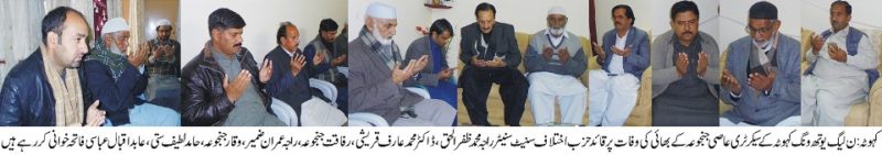 ن لیگ یوتھ ونگ کہوٹہ کے سیکرٹری عاصی جنجوعہ کے بھائی کی وفات پر قائد حزب اختلاف سنیٹ سنیٹر راجہ محمد ظفر الحق کی فاتحہ خوانی۔مسلم لیگ ن یوتھ ونگ تحصیل کہوٹہ کے سیکرٹری اطلاعات عاصی جنجوعہ کے بڑھے بھائی اور راجہ نذیر احمد کے صاحبزادے کی وفات پرپاکستان مسلم لیگ ن کے چیئرمین قائد حزب اختلاف سنیٹ سنیٹر راجہ محمد ظفر الحق،سٹی صدر ن لیگ ڈاکٹر محمد عارف قریشی ،مسلم لیگ ن یوتھ ونگ تحصیل کہوٹہ کے صدر رفاقت جنجوعہ ،جنر ل سیکرٹری حامد لطیف ستی ، پر یس کلب کہوٹہ کے فنانس سیکرٹری راجہ عمران ضمیر ،اخلاق جنجوعہ ،آفتاب جنجوعہ ،عابد اقبال عباسی نے ان کی رہائش گاہ جا کر ان سے دلی تعزیت کا اظہار کیا اور مر حوم کے ایصال ثواب کے لیے فاتحہ خوانی کی ۔
