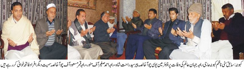 سابق سٹی ناظم کہوٹہ حاجی راجہ جہان عالم کی وفات پر اظہار تعزیت ۔سابق سٹی ناظم راجہ غازی امان اللہ کے بڑھے بھائی ،راجہ امتیاز عالم ، راجہ انتخاب عالم اور راجہ رشید عالم کے والد محترم سابق سٹی ناظم کہوٹہ و صدر انجمن تاجران کہوٹہ حاجی راجہ جہان عالم کی وفات پر چیئرمین یوسی چوآخالصہ پیر سید راحت شاہ،MPAراجہ صغیر احمد کے صاحبزادے راجہ احمد صغیر آف مٹور ،راجہ قمر مسعود آف چوآخالصہ اور ممبر پریس کلب کہوٹہ کبیر جنجوعہ نے ان کی رہائش گاہ پر جا کر ان کے لواحقین سے دلی تعزیت کا اظہار کیا اور مر حوم کے ایصال ثواب کے لیے فاتحہ خوانی کی۔