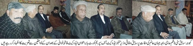 سابق سٹی ناظم حاجی راجہ جہان عالم کی وفات پر سابق وفاقی وزیر سنیئر ایڈوکیٹ آف سپریم کورٹ آف پاکستان بابر اعوان ایڈوکیٹ کا اظہار تعزیت۔سابق سٹی ناظم راجہ غازی امان اللہ کے بڑھے بھائی ،راجہ امتیاز عالم ، راجہ انتخاب عالم اور راجہ رشید عالم کے والد محترم سابق سٹی ناظم کہوٹہ و صدر انجمن تاجران کہوٹہ حاجی راجہ جہان عالم کی وفات پر سابق وفاقی وزیر سنیئر ایڈوکیٹ آف سپریم کورٹ آف پاکستان بابر اعوان ایڈوکیٹ نے ان کی رہائش گاہ پر جا کر ان کے لواحقین سے دلی تعزیت کا اظہار کیا اور مر حوم کے ایصال ثواب کے لیے فاتحہ خوانی کی۔انہوں نے مر حوم کی خدمات کو سراہا اور کہا کہ ان کی وفات سے پیدا ہونے والا خلا صدیوں پر نہیں ہو گا ۔