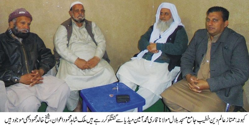 ممتاز عالم دین خطیب جامع مسجد بلا ل مولانا قاری محمد آمین میڈیا سے گفتگو کر تے ہوئے کہا کہ کہوٹہ پولیس انتظامیہ تمام مساجد میں آذان اور نماز کے اقات کو یکساں کرانے میں اپنا کر دار ادا کر یں پولیس تھانہ کہوٹہ کے اے ایس پی سعود خان اور ایس ایچ او سردار ذوالفقار احمد کی کاکر دگی بہت ہی اچھی ہے انہوں نے منشیات فروشوں کے خلاف سخت کاروائی کی ہوئی ہے جو کہ قابل تعرویف ہے اس لیے میں ان سے یہ بھی مطالبہ کر تا ہوں کہ وہ اپنے جائز اختیارات کو استعمال میں لاتے ہوئے کہوٹہ شہر میں تمام مساجد میں آذان اور نماز کے اقات کو یکساں کرانے میں اپنا کر دار ادا کر یں اور جمعہ کی نماز پڑھنے کے لیے تمام دوکانوں کو بند کرانے پر عمل درآمد کراہیں اس موقع پر معروف صحافی و کالم نگار ملک شاہد محمود اعوان اورشیخ خالد محمود بھی موجود ہیں ۔
