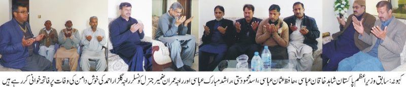 سابق وزیر اعظم پاکستان شاہد خاقان عباسی کاجنرل کونسلر راجہ گلزار احمد کی خوش دامن (ساس) محترمہ کی وفات پر فاتحہ خوانی۔یوسی ہوتھلہ کے جنرل کونسلرراجہ گلزار احمدالمعروف گلزاری کی خوش دامن (ساس) محترمہ گذشتہ ہفتے وفات پا گیں تھیں ان کی وفات پر پاکستان مسلم لیگ ن کے مر کزی رہنماء سابق وزیر اعظم پاکستان شاہد خاقان عباسی ،سابق وزیر اعظم پاکستان کے معاون خصوصی مسلم لیگ ن حلقہ این اے57کے کواڈینئٹر حافظ عثما ن عباسی ،وائس چیئرمین یوسی ہوتھلہ اسد محمود ستی ،مسلم لیگ ن کے سر گرم کارکن راشد مبارک عباسی ،پریس کلب کہوٹہ کے فنانس سیکرٹری راجہ عمران ضمیر ،ڈاکٹر راجہ عرفان ،بابو عابد ستی ،ممبر پریس کلب کہوٹہ کبیر احمد جنجوعہ نے ان کی رہائش گاہ پر جا کر ان سے دلی تعزیت کا اظہار کیا اور مر حومہ کے ایصال ثواب کے لیے فاتحہ خوانی کی ۔
