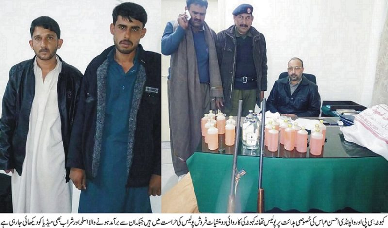 سی پی او روالپنڈی احسن عباس کی خصوصی ہدائت پر پولیس تھانہ کہوٹہ کی کاروائی دو منشیات فروش گرفتار ۔شراب اور اسلحہ قبضے میں لے کر مقدمہ درج کر کے ملزمان کو حوالات میں بند کر دیا ۔تفصیل کے مطابق سی پی او روالپنڈی کی خصوصی ہدائت پر اے ایس پی سعود خان کی احکامات پر ایس ایچ او تھانہ کہوٹہ سردار ذوالفقار نے ایک چھاپہ مار ٹیم تشکیل دی جنہوں نے کھلو ل کے مقام پر ایک پولٹری فارم پر چھاپہ مار دو ملزمان فیصل اور ثمر کو گرفتا ر کر لیا اور ان کے قبضے سے دیسی اور والائتی شراب کی بوتلیں اور دو عدد رائفلز بھی قبضے میں لے کر ملزمان کے خلاف مقدمہ درج کر لیا ۔