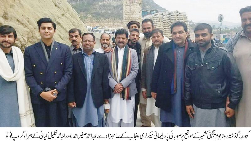 صوبائی پارلیمانی سیکرٹری پنجاب کے صاحبزادے راجہ احمد صغیر احمد اور راجہ محمد شکیل کیانی نے گذشتہ روزیوم یکجہتی کے موقع پر اپنے مشترکہ خطاب میں کہا ہے کہ پاکستانی قوم یوم یکجہتی کشمیر اس عہد کی تجدید کیساتھ منا رہے ہیں کہ آزادی کی جدوجہد میں ہمیشہ مظلوم کشمیریوں کے شانہ بشانہ کھڑے رہیں گے۔ پاکستان سیاسی و عسکری قیادت نے بھی بھارت کو خبردار کیا ہے کہ مقبوضہ کشمیر میں انسانی حقوق کی خلاف ورزیاں بند کی جائیں اور کشمیروں کے حق خود ارادیت کا احترام کیا جائے۔ انھوں نے کہا کہ قتل وغارت کے باجود بھارت آج تک کشمیریوں کے جذبہ آزادی کو دبا نہ سکا، ہر روز کشمیری اپنے پیاروں کو اس عہد کے ساتھ قبروں میں اتارتے ہیں کہ کشمیر کی آزادی تک تکمیل پاکستان کی یہ جنگ جاری رہے گی ان خیالات کا اظہار انہوں نے گذشتہ روزیوم یکجہتی کشمیر کے موقع پر خطاب کرتے ہو ئے کیا اس موقع پرپی پی پی حلقہ پی پی سیون کے رہنماء راجہ محمد شکیل کیانی نے خطاب ہوئے کہا ہے کہ کشمیر پاکستان کی شہ رگ پا نچ فروری کا دن کشمیریوں کی جدوجہد آزادی میں بڑی اہمیت کا حامل ہے کشمیر دراصل تقسیم ہند کا ایسا حل طلب مسئلہ ہے، جو بھارتی حکومت کی ہٹ دھرمی و ظلم و ناانصافی کے باعث تاحال حل نہیں کیا جا سکا اس دوران کشمیری مسلمانوں نے آزادی کشمیر اور اپنے حق خود ارادیت کے حصول کے لیے لاتعداد قربانیوں کی تاریخ رقم کی ہے، جو مسئلے کے حل ہونے و کشمیر کے آزاد ہونے تک جاری رہے گی۔انہوں نے کہا ہے کہ ہمارے کشمیری بھائیوں کی جہد وجہد کا بڑا دن ہے پاکستان قوم انکے ساتھ شانہ بشانہ کھڑی ہے۔اس موقع پر نوجوان سیاسی وسماجی شخصیت راجہ عمران مینوں آف موہڑہ لنگڑیال،انجینئر راجہ بلال ،چوہدری اسد آف سموٹ ، عبد العزیز پاشا،نمبردار اسد عزیز ، گلفراز کیانی ، راجہ عابد آف مٹور سمیت دیگر افرادموجود تھے ۔