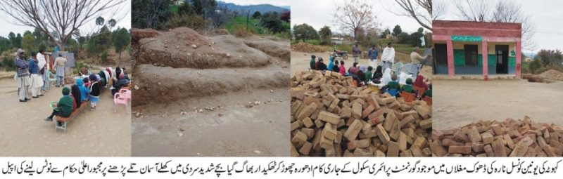 Kahuta; The Contractor working at Dhok Mughlan, UC Nara school has run away leaving work halfway, The school children at the school are left to study in open air. Parents have asked education department to take action.