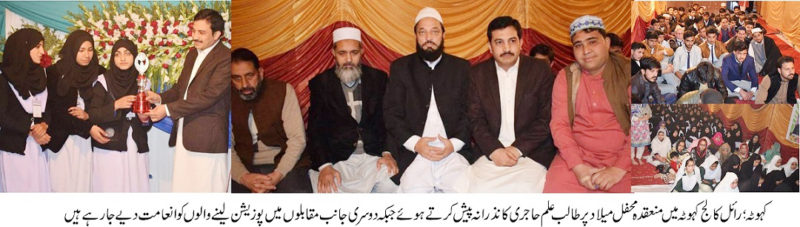 رائل کالج کہوٹہ میں محفل میلاد النبی ﷺطلبا اور طالبات نے آقائے دو جہاں حضرت محمد مصطفی ﷺ کی بارگاہ میں ہدیہ عقیدت کے پھول نچھاور کیے پرنسپل کالج ہذانے بچوں میں انعامات بھی تقسیم کیے۔ دنیاوی تعلیم کے ساتھ ساتھ دینی تعلیم بھی انتہائی ضروری ہے اللہ اور اسکے رسول ﷺ سے محبت ہی دنیا اور اخرت میں کامیابی کا ذریعہ ہے ان خیالات کا اظہار رائل کالج کہوٹہ میں محفل میلاد سے خطاب کرتے ہوئے پرفیسر عابد ، ساجد عباسی ایڈووکیٹ، اور پرنسپل رائل کالج کہوٹہ عبدالراؤف قریشی نے کیا محفل میلاد میں طلباء و طلبات نے حضور ﷺ کی شان میں عقیدت کے پھول نچھاور کیے اس موقع پر نعت قرات اور تقاریر کے مقابلوں بھی ہوئے جس پر طالب علموں نے بھرپور حصہ لیا اخر میں پوزیشن لینے والوں کو انعامات بھی دیے گے ۔