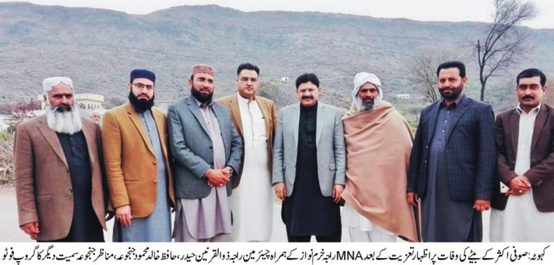 صوفی اکثر کے بیٹے کی وفات پر چیئرمین قائمہ کمیٹی ممبر قومی اسمبلی راجہ خرم نواز ،حافظ خالد محمود جنجوعہ اور دیگر کا اظہار تعزیت ۔چراہ کے رہائشی پی ٹی آئی رہنماء صوفی علی اکثر کا جوانسالہ بیٹا محمد اکمل گذشتہ دنوں وفات پا گیا تھا اس کی وفات پرچیئرمین قائمہ کمیٹی ممبر قومی اسمبلی راجہ خرم نواز ،فرزند چراہ یوسی 9چیئرمین راجہ ذوالقرنین حیدر ، معروف سماجی اور مذہبی شخصیت حافظ خالد محمود جنجوعہ ،صوفی عبد المجید ،قاری اجمل اور مناظر جنجوعہ نے ان کی رہائش گاہ جا کر ان سے دلی تعزیت کا اظہار کیا اور مر حوم کے ایصال ثواب کے لیے فاتحہ خوانی کی ۔
