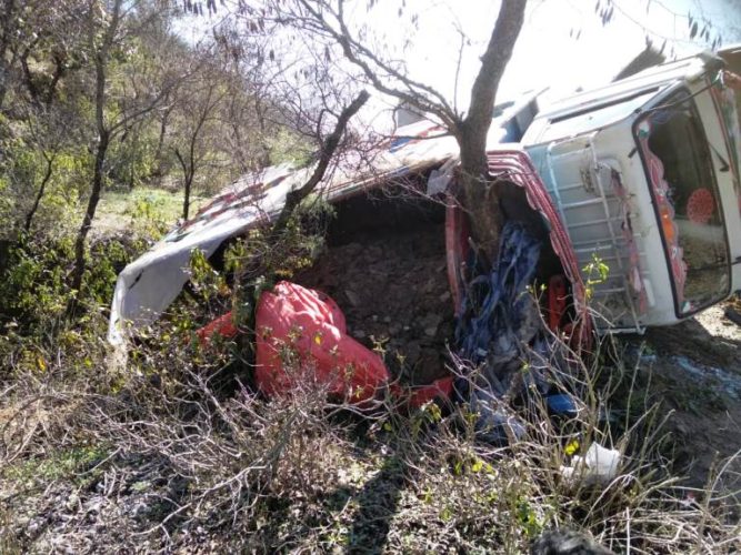 Sir sooba shah; Truck loaded with bricks overturns and falls in steep ditch near namb Mirgala