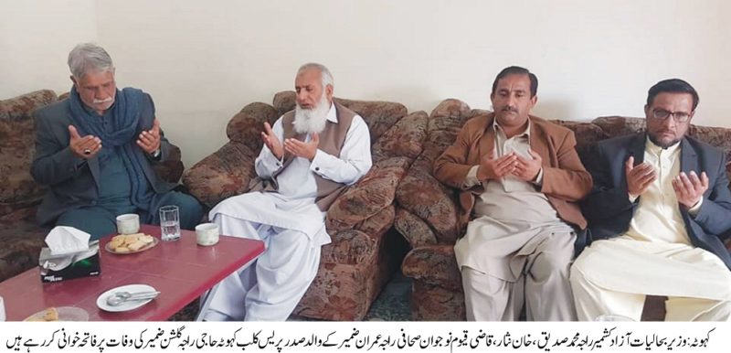 وزیر بحالیات آزاد کشمیر راجہ محمد صدیق نے صدر پریس کلب کہوٹہ حاجی راجہ گلشن ضمیر کی وفات پر نوجوان صحافی راجہ عمران ضمیر اور راجہ عثمان ضمیر سے گھر جا کر تعزیت اور دعا کی ۔انکے ہمراہ جنرل سیکرٹری خان نثار احمد ، خان شبیر خان۔ قاضی عبدالقیوم ، راجہ رفاقت جنجوعہ صدر یوتھ ونگ مسلم لیگ ن ، جنرل سیکرٹری حا مدلطیف ستی و دیگر بھی ہمراہ تھے ۔اس موقع پر راجہ محمد صدیق نے راجہ گلشن ضمیر کی سیاسی و سماجی اور صحافی خدمات کو زبردست خراج تحسین پیش کیا۔اور کہا کہ انھوں نے ہمیشہ حق اور سچ کی صحافت کو فروغ دیا۔ اور علاقہ کے مسائل کو اجاگر کیا۔