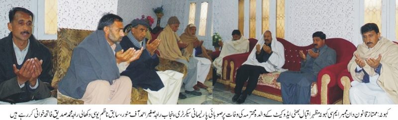 ممتاز قانون دان ممبر ایم سی کہوٹہ مظہر اقبال بھٹی ایڈوکیٹ کے والدہ محترمہ کی وفات پر اظہار تعزیت ۔تحصیل کہوٹہ کی معروف سیاسی وسماجی شخصیت ممتاز قانون دان ممبر ایم سی کہوٹہ مظہر اقبال بھٹی ایڈوکیٹ کی والدہ محترمہ گذشتہ روز قبل وفات پا گیں تھی ان کی وفات پر صوبائی پارلیمانی سیکرٹری پنجاب راجہ صغیر احمد آف مٹور ، سابق ناظم یوسی دکھالی راجہ محمد صدیق نے ان کی رہائش گاہ جاکر ان سے دلی تعزیت کا اظہار کیا اور مر حومہ کے ایصال ثواب کے لیے فاتحہ خوانی کی ۔