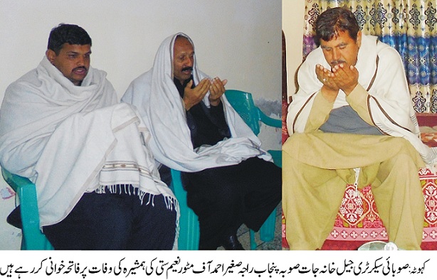 نعیم ستی کی ہمشیرہ محترمہ کی وفات پر اظہار تعزیت ۔یونین کونسل نڑھ کے رہائشی نعیم ستی اور وسیم ستی کی ہمشیرہ محترمہ گذشتہ روز قبل وفات پا گیں تھیں ان کی وفات پر صوبائی سیکرٹری جیل خانہ جات صوبہ پنجاب راجہ صغیر احمد آف مٹور نے ان کی رہائش گاہ جا کر ان سے تعزیت کا اظہار کیا اور مر حومہ کے ایصال ثواب کے لیے فاتحہ خوانی کی ۔