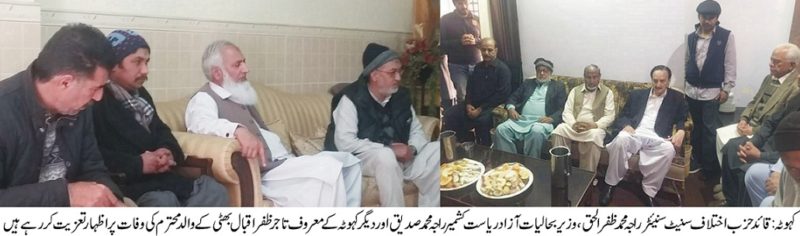 قائد حز ب اختلاف سنیٹ سنیئٹر راجہ محمد ظفر الحق ،وزیر بحالیات آزاد ریاست کشمیر راجہ محمد صدیق کا پر ویز مغل کے بھائی اور تاجر ظفر بھٹی کے والد محترم کی