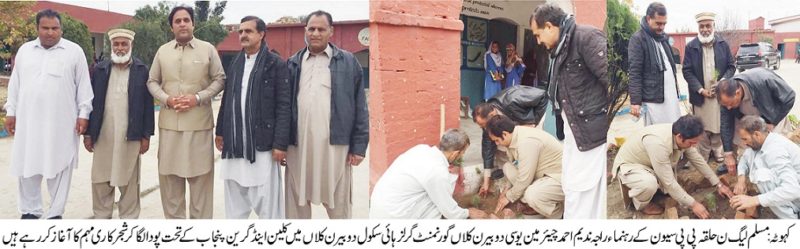 گرین اینڈ کلین پنجاب کے تحت مسلم لیگ ن حلقہ پی پی سیون کے رہنماء راجہ ندیم احمد چیئرمین یوسی دوبیرن کلاں گورنمنٹ گرلز ہائی سکول دوبیرن کلاں میں پودا لگا کر شجر کاری مہم کا آغاز کیا ۔حکومت پنجاب کی ہدائت پر پنجاب بھر میں شجر کاری ، صفائی کے حوالے سے یوسیزلیول پر پروگرام کیے جارہے ہیں اسی سلسلے میں گذشتہ روز قبل گورنمنٹ گرلز ہائی سکول دوبیرن کلاں میں مسلم لیگ ن حلقہ پی پی سیون کے رہنماء راجہ ندیم احمد چیئرمین یوسی دوبیرن کلاں نے پواد لگا کر شجر کاری مہم کا آغاز کیا اس موقع پر انہوں نے نمائندے سے فون پر گفتگو کرتے ہوئے کہا کہ در خت ہماری زندگی کا ایک اہم حصہ ہیں درخت انسان کو آکسیجن مہیاکر تا ہے جس کے ذریعے انسان سانس لیتا ہے انہی در ختوں کی وجہ سے ماحول میں خوبصورتی ہوتی ہے اور یہ آلودگی کو کم کر نے میں بھی اپنا اہم کر دار ادا کرتے ہیں انہوں نے کہا کہ درخت ایک جاندار ہے اور یہ بھی اپنے مالک کی تسبیح کر تا ہے حکومت جنگلات کی کٹائی اور جنگل کی آگ پر قابو پانے کے لیے ایک موثر اورجامع پر وگرام بنا ہیں تاکہ ہمارے جنگلات بچ سکیں اور ہم آنے والی نسلیں بھی ان سے مسعفید ہو سکیں ۔