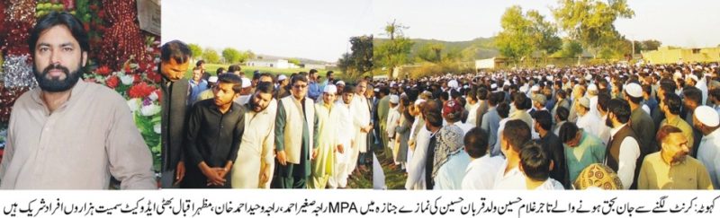 اپنی ہی دوکان کے ڈیفریز سے کرنٹ لگنے سے جوان تاجر غلام حسین جان بحق ۔نمازے جنازہ میں ایم پی اے راجہ صغیر احمد آف مٹور سمیت ہزاروں افراد کی شر کت ۔تفصیل کے مطابق گذشتہ قبل کہوٹہ کے معروف تاجر حاجی قر بان حسین کا 35سالہ بیٹا غلام حسین جو کہ ڈریکشوریشن کا کام کر تا گذشتہ روز اس نے جب اپنی دوکان کھولی اور وہان موجود ڈیفریز میں پھول نکالنے لگا تو بجلی کا شدید کرنٹ لگا جو جان لیوا ثابت ہوا۔غلام حسین کی موت کی خبر جنگل کی آگ کی طرع شہر میں پھیل گئی جوان موت پر ہر ایک آنکھ اشکبار تھی مر حوم کی نمازے جنازہ ان کے آبائی گاؤں ٹھنڈاپانی میں ادا کیا گیا نمازے جنازہ میں رکن پنجاب اسمبلی حلقہ پی پی سیون راجہ صغیر احمد ،پی ٹی آئی کے سنیئر رہنماء راجہ وحید احمد خان ،چیئرمین ایم سی کہوٹہراجہ ظہور اکبر،ممبران ایم سی کہوٹہ مظہر اقبال بھٹی ایڈوکیٹ، عبد الحمید قریشی ایڈوکیٹ،حاجی ملک عبدالرؤف،راجہ محمد فیصل،چیئرمین یوسی دوبیرن خورد راجہ ظفر اقبال بگہاروی، وائس چیئرمین مرزا محمد مسعود، چیئرمین یوسی کھڈیوٹ سجاد ستی سمیت ہزاروں افراد نے شر کت کی ۔انتہائی خوش اخلاق اور مذاج تاجر کی اچانک موت پر شہر کی تمام مارکیٹ کے تاجر اشکبار تھے ۔