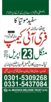 سکوٹ( نمائندہ پوٹھوار ڈاٹ کوم، انوار الحق راجہ سے)المصطفیٰ ویلفیئر ٹرسٹ (یو کے )کے زیر اہتمام حاجی محمد بشیر(مرحوم) کے کے ایصال ثواب کے لیے ہر سال کی طرح اس سال بھی چوتھا سالانہ سفید موتیا کا فری آئی کیمپ مو رخہ 23اپریل بروز منگل ٹیالہ دوبیرن کلاں میں منعقد ہو رہا ہے۔ کیمپ میں مریضوں کا مفت معائنہ کے ساتھ ساتھ سفید مو تیا کے مریضوں کا فری آپریشن ماہر ڈاکٹرز کے زیر نگرانی کیا جا ئے گا۔کیمپ حاجی جلال خان، حاجی محمد منیر اور ذرین بھٹی آف ٹیالہ دوبیرن کلاں کے خصوصی تعاون سے منعقد ہو رہا ہے۔