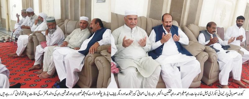 مٹور:نمائندہ پوٹھوار ڈاٹ کوم کبیر احمد جنجوعہ سے۔صوبائی پارلیمانی سیکرٹری جیل خانہ جات راجہ صغیر احمدکا چیف ایڈیٹر پوٹھوار ڈاٹ کوم محمد نصیر راجہ کی والدہ محترمہ کی وفات پر اظہار تعزیت۔ معروف صحافی وچیف ایڈیٹر پوٹھوار ڈاٹ کوم محمد نصیر راجہ اور محمد شبیر راجہ کی والد ہ محترمہ گذشتہ روز قبل وفات پا گیں تھیں گذشتہ صوبائی پارلیمانی سیکرٹری جیل خانہ جات راجہ صغیر احمد، راجہ ثقلین آف ممیام، انجینر راجہ بلال بنگیال،راجہ عمران مینوں اور ممبر پریس کلب کہوٹہ کبیر احمد جنجوعہ نے ان کی رہائش گاہ جا کر ان سے دلی تعزیت کا اظہار کیا اور مرحومہ کے ایصال ثواب کے لیے فاتحہ خوانی کی۔