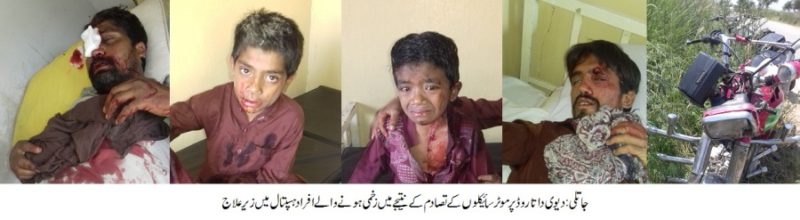 Gujar Khan; Five people were injured when two motorbikes collided head on at Devi Datta road in Dhok Karmi, the injured were taken to hospital in Gujar Khan, amongst the injured were Sabir Hussain Shah of Dhok Syedan and Haider Hassan.