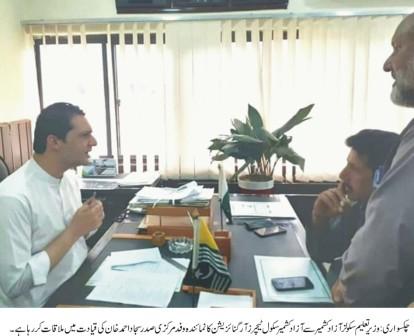 چکسواری (نمائندہ پوٹھوارڈاٹ کوم)آزاد کشمیر سکول ٹیچرز آرگنائزیشن ضلع میرپور کے صدر چوہدری محمدسعیدعالم نے بیرسٹر افتخار گیلانی وزیر تعلیم سکولز آزاد کشمیر سے آزاد کشمیر سکول ٹیچرز آرگنائزیشن کے نمائندہ وفد کی آزاد کشمیر سکول ٹیچرز آرگنائزیشن کے مرکزی صدر سردار سجاد احمد خان کی قیادت میں ہونے والی ملاقات کا خیر مقدم کیا ہے اور کہا ہے کہ آزاد کشمیر سکول ٹیچرز آرگنائزیشن کے مرکز ی صدر سردار سجاد احمد خان نے اعلی سطحی ملاقات میں آزاد کشمیر کے اساتذہ کے اہم ترین مسئلہ سکیل اپ گریڈیشن کے حوالے سے جاندار موقف اختیار کیا اور اساتذہ کی بھرپور نمائندگی کی چودھری محمدسعیدعالم نے اس توقع کااظہار کیاکہ انشاء اللہ سکیل اپ گریڈیشن کا معاملہ جلد یکسو ہو جائے گاانہوں نے کہا کہ سردار سجاد احمد خان نے وزیر تعلیم سکولز آزاد کشمیر سے مطالبہ کیا کہ سکیل اپ گریڈیشن کے حوالے سے اساتذہ کے اندر بے چینی پائی جاتی ہے یہ اہم ترین مسئلہ حل کرکے اساتذہ کی بے چینی کم کی جائے وزیرتعلیم سکولز آزاد کشمیر نے وفد کو یقین دلایاکہ وہ خود وزیر اعظم آزاد کشمیر کی موجودگی میں سکیل اپ گریڈیشن کے حوالے سے ایک اعلی سطحی میٹنگ کراوئیں گے جس میں اساتذہ کی سکیل اپ گریڈیشن کا معاملہ حل کرنے کی کوشش کی جائے گی اس حوالے سے ٹیچرز آرگنائزیشن کے مرکزی صدر اور دیگر نمائندہ گان نے وزیر تعلیم سکولز آزاد کشمیر بیرسٹر افتخار گیلانی کا شکریہ ادا کیا چوہدر ی محمد سعید عالم نے کہا کہ وزیر اعظم آزاد کشمیر راجہ فاروق حیدر خان نے آزاد کشمیر سکول ٹیچر آرگنائزیشن کے مطالبے پر اساتذہ کے اہم ترین مسئلہ سکیل اپ گریڈیشن کے حل کاوعد ہ کیا ہوا ہے جوانشاء اللہ وہ پورا کریں گے اور اساتذہ کی دعائیں لیں گے
