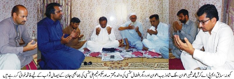سابق ایم پی اے کرنل محمد شبیر اعوان کاافضال شمسی کی والدہ محترمہ اور حکیم نعیم علی شمسی کی بھابھی جان وفات پر اظہار تعزیت۔پریس کلب کہوٹہ کے سیکرٹری نشر واشاعت افضال شمسی کی والدہ محترمہ اورکہوٹہ کے معروف معالج حکیم نعیم علی شمسی کی بھابھی جان گذشتہ روز قبل وفات پاگیں تھیں گذشتہ روز سابق ایم پی اے کرنل محمد شبیر اعوان، ملک شاہ زیب اعوان، ماسٹر زبیر، عدیل احمد،ممبر پریس کلب کہوٹہ کبیر احمد جنجوعہ نے افضال شمسی کی والدہ محترمہ اور حکیم نعیم علی شمسی کی بھابھی جان کی وفات پر ان سے اظہار تعزیت کیا اور مر حومہ کے ایصال ثواب کے لیے فاتحہ خوانی کی۔