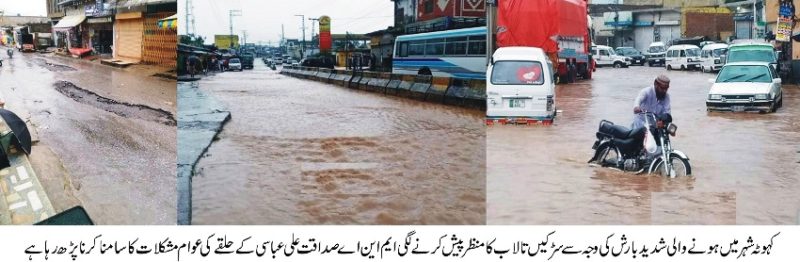 کہوٹہ شہر میں ہونے والی شدید بارش نے حکومت اور انتظامیہ کی “حسن کار کر دگی”کا پول کھول دیا۔شہر بھر کی سٹر کیں تالاب کا منظر پیش کر نے لگی سٹرک کی سائیڈ سے دوسری سائیڈ جانا عذاب بن گیا۔پی ٹی آئی کے منتخب ممبرقومی اسمبلی صداقت علی عباسی کے حلقے کی عوام کو شدید مشکلات کا سامنا جدید دور میں بھی پتھر کے دور کی زندگی گزارنے پر مجبور۔عوام علاقہ سخت نالاں۔ تفصیل کے مطابق حلقہ این اے ستاون کی تحصیل کہوٹہ کی عوام جدید دور میں بھی بنیادی سہولیات سے محروم ہیں حلقے کی عوام نے سابقہ حکومت کے امیدوار شاہد خاقان عباسی سے ناراضگی کا اظہار کرتے ہوئے اپنا ووٹ “تبدیلی سر کار”کو دے کر ان کو کامیاب کیا کہ اب کہوٹہ میں دودھ کی نہریں بہا کر یں گئی مگر حالت یہ ہے کہ بارش کے موسم میں نالوں اورگٹروں کا پانی سٹر کوں پر آ جا تا ہے جس کی وجہ سے سٹر کیں تالاب کا منظر پیش کرتی ہیں یہی پانی لوگوں کی دوکانوں اور گھروں میں شامل ہو جا تا ہے اہلیان علاقہ نے اپنے منتخب ممبر قومی اسمبلی اور تحصیل انتظامیہ کہوٹہ کی کار کر دگی پر سخت مایوسی کا اظہار کیا ہے۔مٹور:نمائندہ پوٹھوار ڈاٹ کوم کبیر احمد جنجوعہ سے۔۔۔۔