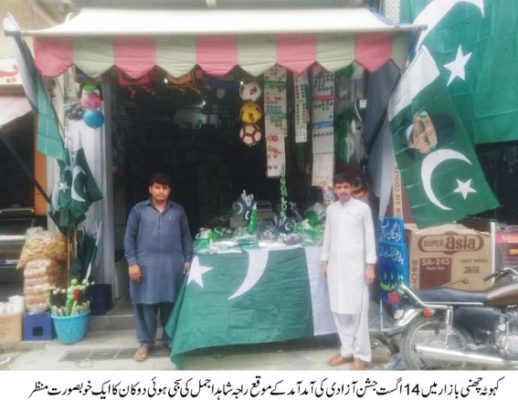 ملک کے دیگر شہروں کی طرع کہوٹہ شہر میں بھی جشن آزادی کی تیاریاں عروج پر۔ کہوٹہ چھنی بازار میں 14اگست جشن آزادی کی آمد آمد کے موقع راجہ شاہد اجمل نے ہر سال کی طرع اس سال بھی اپنی دوکان پر بے شمار جھنڈے جھنڈیاں لائیں اور دوکان کو خوبصورت انداز میں سجایا جبکہ جگہ جگہ سبز ہلالی پر چموں اور خوبصورت بیجوں کے بڑھے بڑھے سٹال لگے ہوئے ہیں جہاں خریدنے والوں کا کافی رش لگا رہتا ہے اس سلسلے میں بچوں اور بڑھوں میں خاصی جو ش و خروش دیکھا گیا ہے۔ راجہ شاہد اجمل، ملک زبیر آف چھنی بازار نے ہر سال کی طرع اس سال بھی جشن آزادی کو جو ش و خروش کے ساتھ منانے کا عزم کیا ہے۔