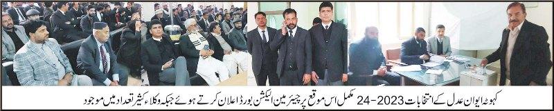 Elections of the House of Justice 2023-24 After a full thorny contest, the presidential candidate’s Raja Aqeel Haidari Advocate and Sardar Imran Akbar Advocate tied with 38-38 votes, Raja Faisal Nazir Advocate General Secretary, Raja Imran Iqbal Advocate Vice President and Raja Nadeem Rauf Advocate Joint. Elect Secretary. According to the details, after the interesting competition between the House of Justice Elections 2023-24 full alliance group Raja Muhammad Sattarullah Advocate, Zulfiqar Mahmoud Kayani Advocate and Raja Saeed Ahmed Advocate Group, the candidates for the presidency are N Aqeel Haidari Advocate and Sardar Imran Akbar. Advocate tied with 38-38 votes while Raja Faisal Nazir Advocate of Raja Saeed Ahmed Advocate Group was elected General Secretary with 40 votes while Khalid Zaheer Raja of Raja Muhammad Sattarullah Advocate Group got 37 votes. From the group, Raja Imran Iqbal Advocate with 40 votes will be elected as the Vice President and Raja Nadeem Rauf Advocate with 41 votes will be elected as the Joint Secretary, while the Vice President candidate from the Raja Saeed Ahmed Advocate Group, Raja Rashid Advocate 37 joint secretary candidates managed to get 36 votes. The polling process started from 9 am and continued till 4 pm. Chairman of Election Board Gulfan Khan Advocate announced the final result while saying that a decision will be made later regarding the presidential candidates. On this occasion, lawyers, and political and social personalities congratulated the successful lawyers.