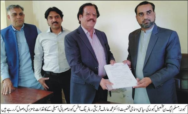 Dr. Mohammad Arif Qureshi is receiving the nomination papers of the Provincial Assembly at the Returning Office