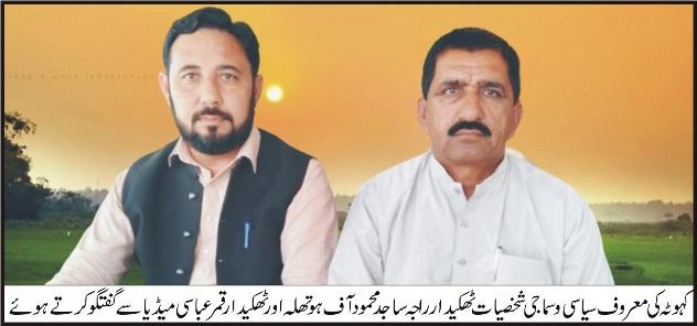 راجہ ندیم احمد امیدوار برائے صوبائی اسمبلی پنجاب حلقہ پی پی سیون کی تھوہا آمد،پیپلز سیکرٹریٹ کا دورہ کیاسابق چیئرمین یوسی مٹور راجہ اشتیاق احمد نے بھر پور استقبال کیا،آمدہ الیکشن کے حوالے سے تفصیلی گفتگو،تفصیل کے مطابق گذشتہ روز معروف لیگی رہنماء راجہ ندیم احمد امیدوار برائے صوبائی اسمبلی پنجاب حلقہ پی پی سیون نے یونین کونسل مٹورکا دورہ کیااس موقع پر ان کے ہمراہ سابق چیئرمین یوسی بیور راجہ فیاض احمد،تنویر ناز بھٹی امیدوار برائے چیئرمین یوسی نلہ مسلماناں،شیخ احسن سرائیکی اور دیگرافراد بھی ہمراہ موجود تھے راجہ ندیم احمد امیدوار برائے صوبائی اسمبلی پنجاب حلقہ پی پی سیون نے تھوہا کے مقام پر پیپلز سیکرٹریٹ میں بھی گے جہاں سابق چیئرمین یوسی مٹور راجہ اشتیاق احمد نے بھر پور استقبال کیا اس موقع پر راجہ ندیم احمدنے ان کا شکریہ ادا کیا اور کہا کہ عوام کی خدمت کا جذبہ لے کر آیا ہوں انشاء اللہ خادم بن کر خدمت کروں گاپہلے بھی بطور چیئرمین اپنے علاقے میں بے شمار ترقیاتی کام کراے ہیں اللہ نے موقع دیا تو مزید خدمت کر وں گا۔سابق چیئرمین یوسی مٹور راجہ اشتیاق احمدنے آمدہ الیکشن کے حوالے سے تبادلہ خیال کیا اور راجہ ندیم احمد کے الیکشن میں حصہ لینے کے فیصلے پر اپنی نیک خواہشات کا اظہار کیااور کہاکہ پیپلز پارٹی اور راجہ ندیم احمد کے خیالات میں کافی ہم آہنگی پائی جاتی ہے ہماری سیاسی منزل ایک ہے اور صرف اور صرف عوام کی خدمت ہے انہوں نے راجہ ندیم احمد کی عوامی خدمت کے جذبے اور کوششوں کو سراہا ہے۔