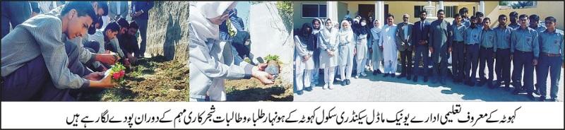 کہوٹہ کے معروف تعلیمی ادارے یونیک ماڈل سیکنڈری سکول کہوٹہ کے ہونہار طلباء و طالبات نے پودے لگا کر شجر کاری مہم کا آغاز کیا،پرنسپل راجہ رفاقت حسین کی نگرانی میں سکول کے بچوں اور بچیوں نے پودے لگا کر شجر کاری مہم کا آغاز کیا اس موقع پر پرنسپل راجہ رفاقت حسین نے اپنے سکول کے طلباء و طالبات کو در ختوں کے اہمیت کے حوالے سے آگاہ کر تے ہوئے کہا کہ انسانی زندگی میں درختوں کا اہم کردار ہے شجر کاری کا معیشت اور خوش حالی سے گہراتعلق ہے درختوں میں حسن فطرت کی رعنا ئیاں، نظر آتی ہیں ان کے دلکش منا ظر جس سے آنکھوں کو ٹھنڈ ک اور دل ودماغ کو قوت ملتی ہے انہوں نے کہا کہ اللہ پاک نے باغات کا ذکر فر ما کر قرآن نے پیڑ پو دوں کی اہمیت بتائی روئے زمین پرجا بجا پھیلے پیڑ پودے بنی نوع انسان کے لیے قدرت کا انمول تحفہ ہیں درخت نہ صرف سایہ دیتے ہیں بلکہ ماحو لیاتی آلود گی کو کم کرتے ہیں، سیلاب کی تباہ کاریوں سے بچا تے ہیں،زمین کے کٹا ؤ کو روکتے ہیں انہوں نے کہا کہ افسوس ہے کہ درخت جس رفتار سے کاٹے جارہے ہیں اگر ان کی روک تھام کے لیے موثر اقدام نہ کیا گیا تو یہ دنیا ختم ہو جائے گئی۔