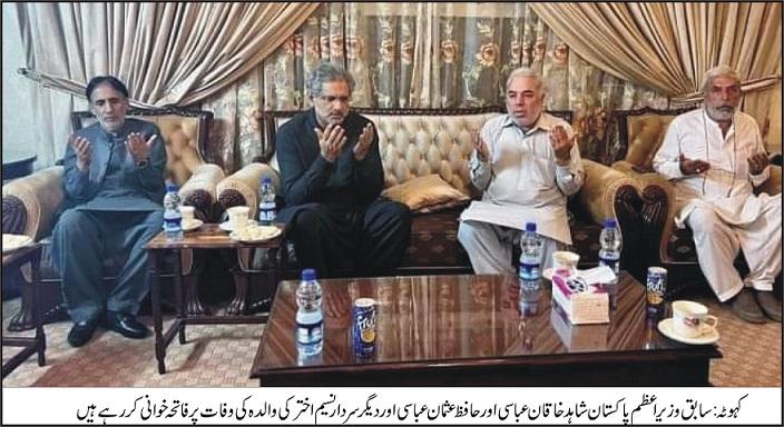 سابق وزیر اعظم پاکستان شاہد خاقان عباسی اور حافظ عثمان عباسی کا سردار نسیم اختر سے اظہار تعزیت،تفصیل کے مطابق مسلم لیگ ن ضلع راولپنڈی کی معروف سیاسی وسماجی شخصیت سردار نسیم اختر کی والدہ ماجدہ گذشتہ دنوں وفات پا گیں تھیں گذشتہ روز مسلم لیگ ن کے مر کزی رہنماء سابق وزیر اعظم پاکستان شاہد خاقان عباسی اورمعاون خصوصی ونائب صدر مسلم لیگ ن صوبہ پنجاب حافظ عثمان عباسی نے سردار نسیم اختر کی رہائش گاہ جا کر ان سے اظہار تعزیت کا اور مرحومہ کے ایصال ثواب کے لیے فاتحہ خوانی کی۔