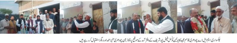 Chaksawari (Pothwar.com, Allah Ditta Bismal, March 24, 2023)- Central Deputy Secretary General of Pakistan Peoples Party Azad Kashmir Chaudhary Qasim Majeed MLA visited the Union Council Faiz pur Sharif yesterday during the visit, Chaudhry Munir Ahmed participated as special guests in the ceremony held on the occasion of Chairman Union Council Faiz pur Sharif taking charge of his post.