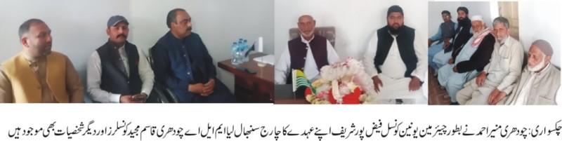 Chakswari, AJK: “Ch Munir Ahmad takes charge as Chairman of Union Council Faiz Pur Sharif amidst a ceremony held to mark the occasion.”